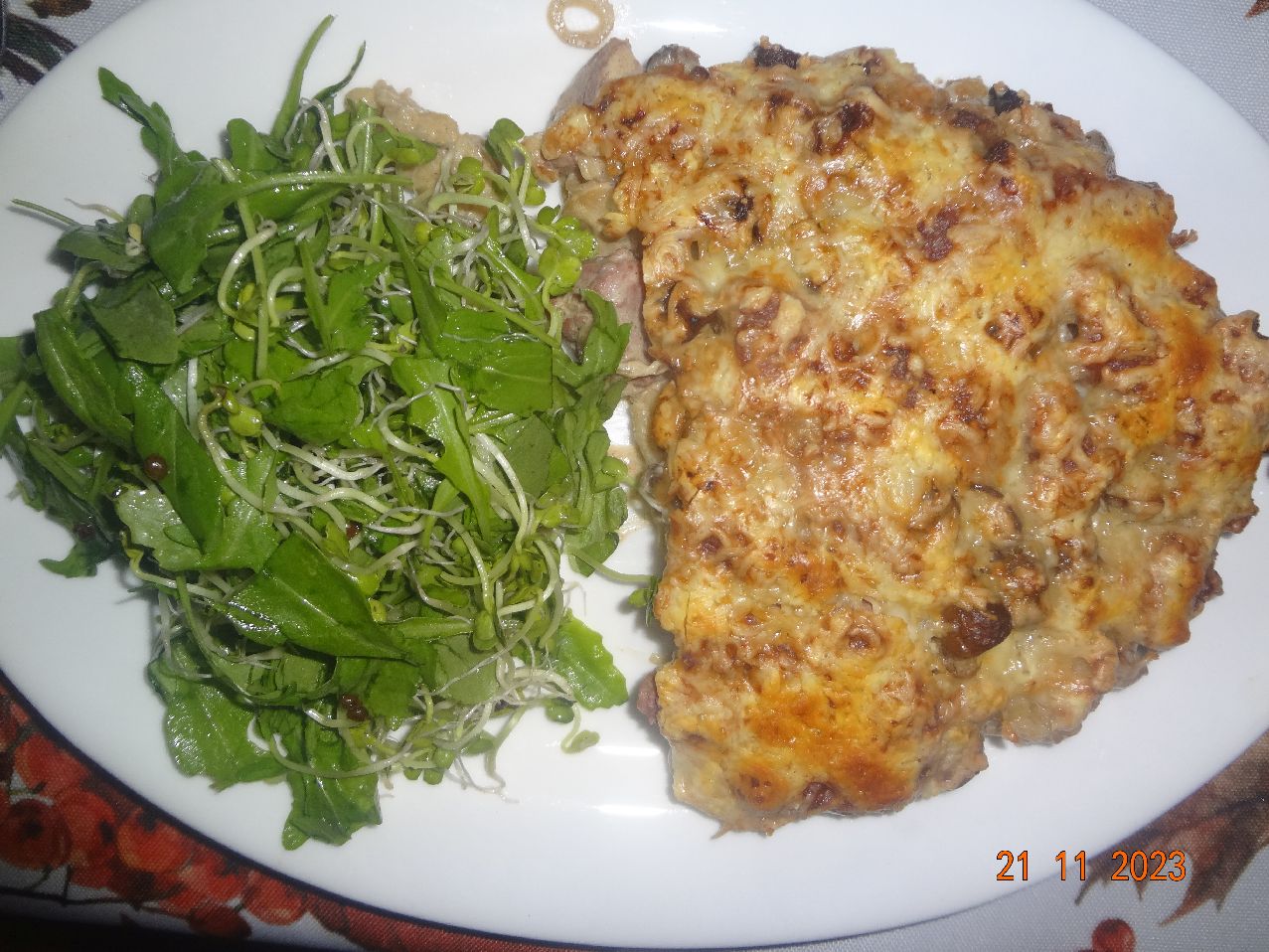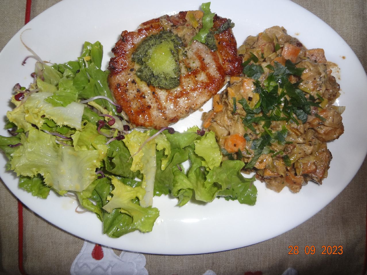 Schweine-Rücken-Steak mit Ananas, Käse, Bauern-Pfannen-Gemüse, Eichblatt-Salat rot mit China-Rose-Sprossen
