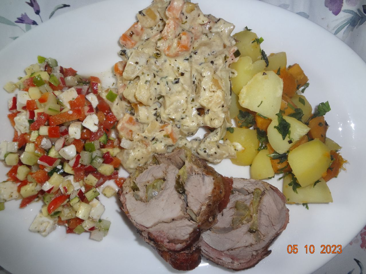 Gefülltes Schweine-Filet, Kohlrabi-Möhren-Apfel-Gemüse in Käse-Weißwein-Schmand-Soße, Süß-, Pet.-Kart., Gemüse-Mozzarella-Salat