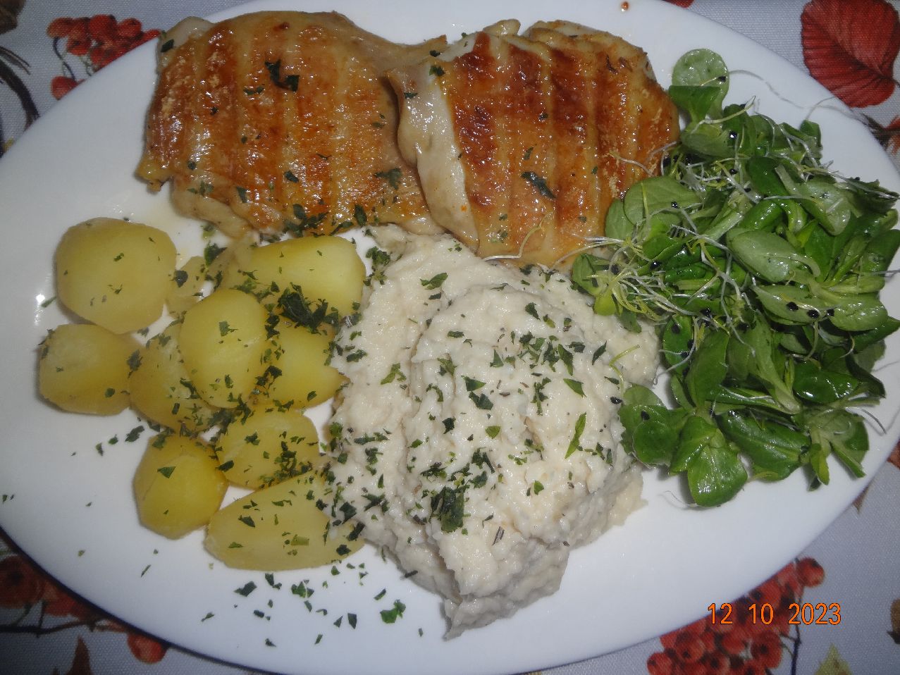Fritierte Hähnchen-Schenkel vom Kontaktgrill, Blumenkohl-Püree, Kartoffeln, Feldsalat mit Porree-Sprossen