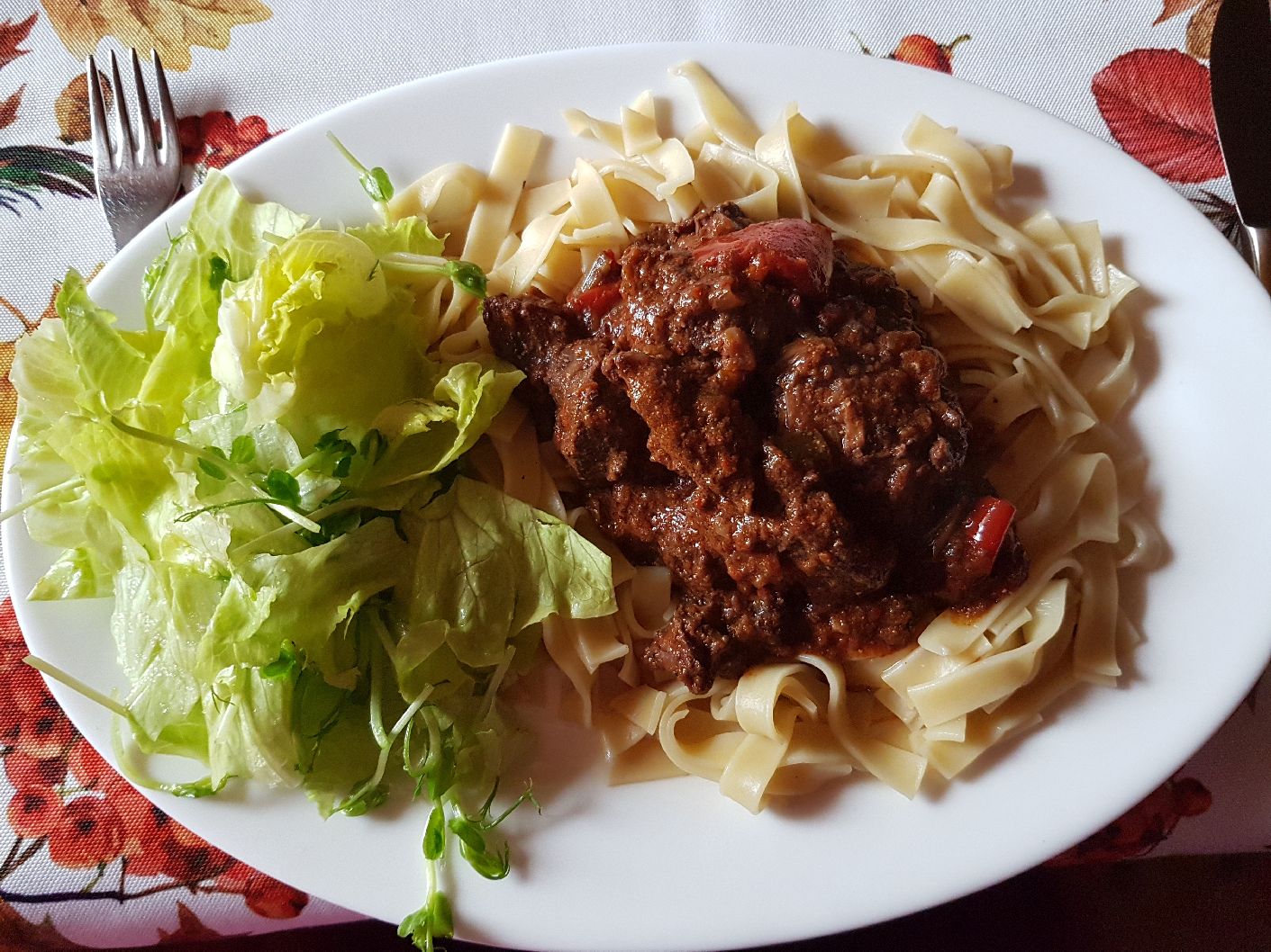 Feuriger Rinder-Gulasch, Tagliatelle, Eisbergsalat mit Erbsen-Sprossen