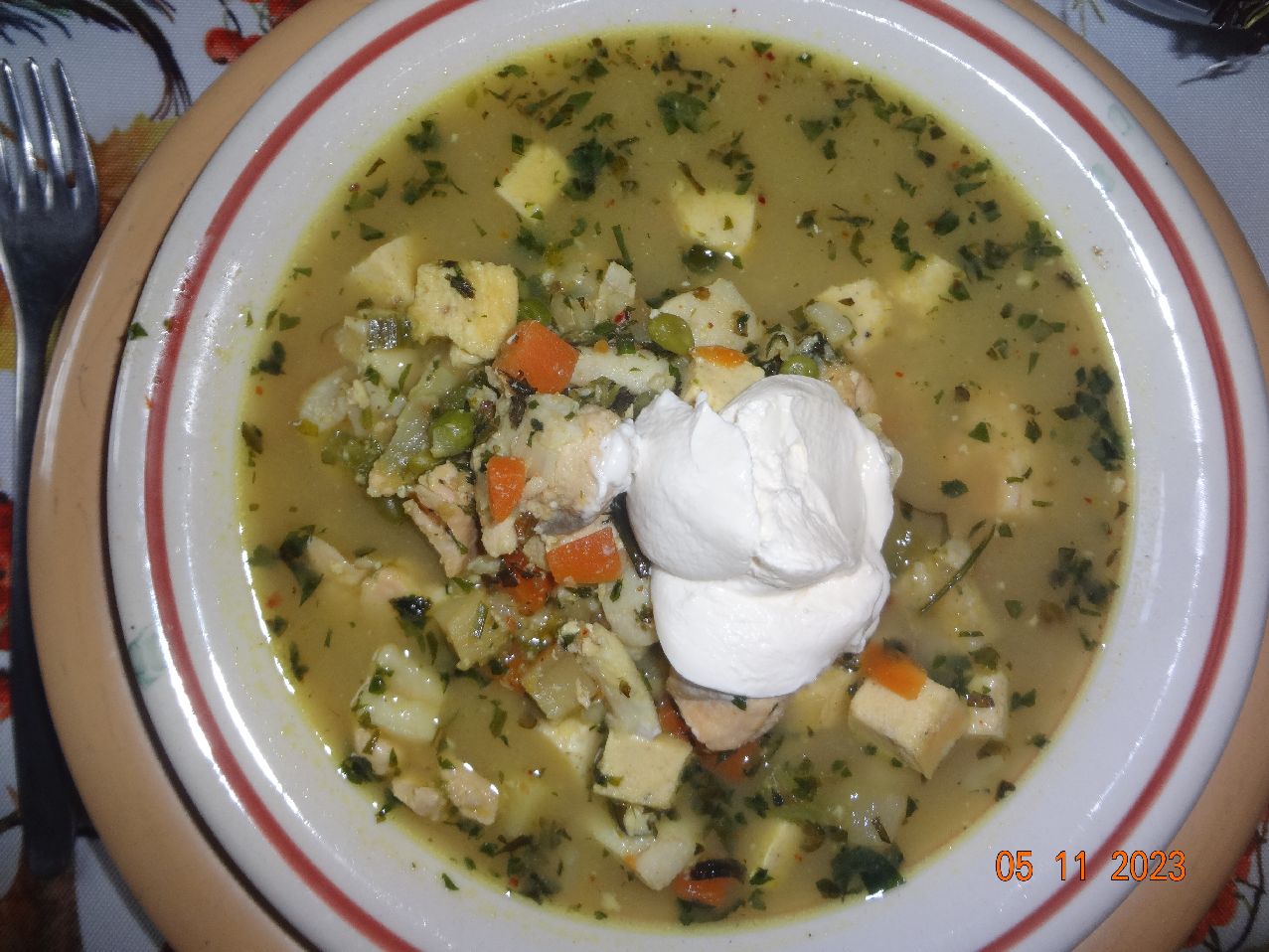 Gemüse-Suppe mit Lachs, Garnelen, Feldsalat mit Sprossen