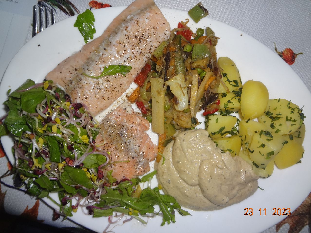 Forellen-Filet, Asia-Gemüse mit italienischen Kräutern in Sekt-Schmand-Soße, Gemüse-Salat mit Mozzarella
