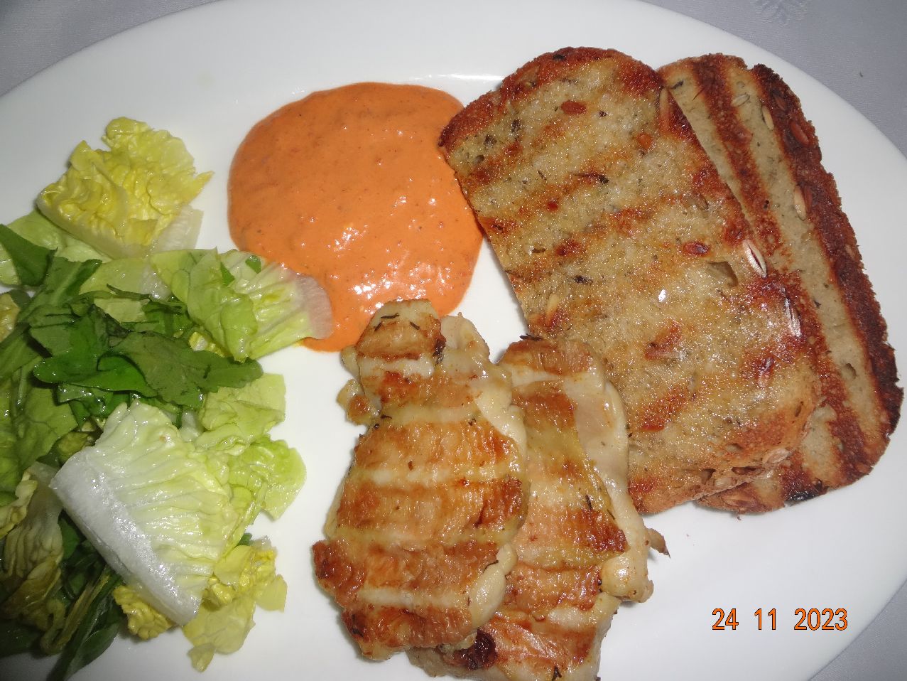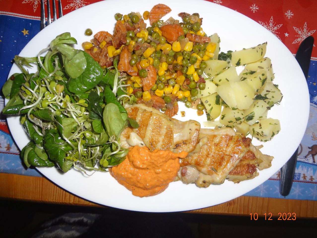 Gegrillte Hähnchen-Oberschenkel-Scheiben, Ajvar-Tomatenmark-Schmand-Dip, Pet.-Kart., Mischgemüse, Feldsalat mit Sprossen