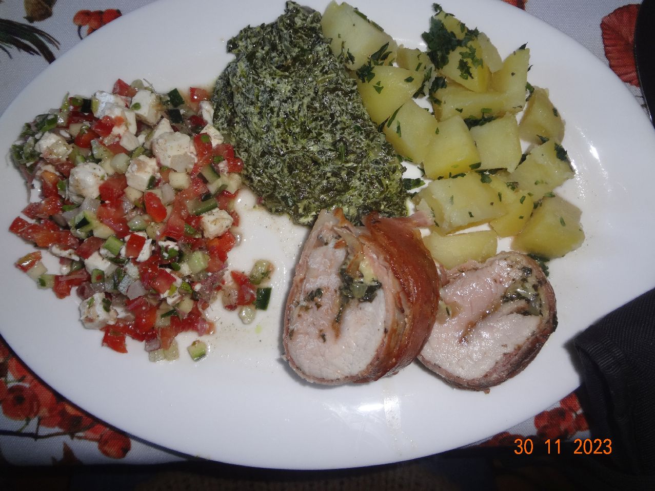 Gefülltes Schweine-Filet im Speckmantel, Rahm-Spinat, Pet.-Kart., Gemüse-Salat mit Feta