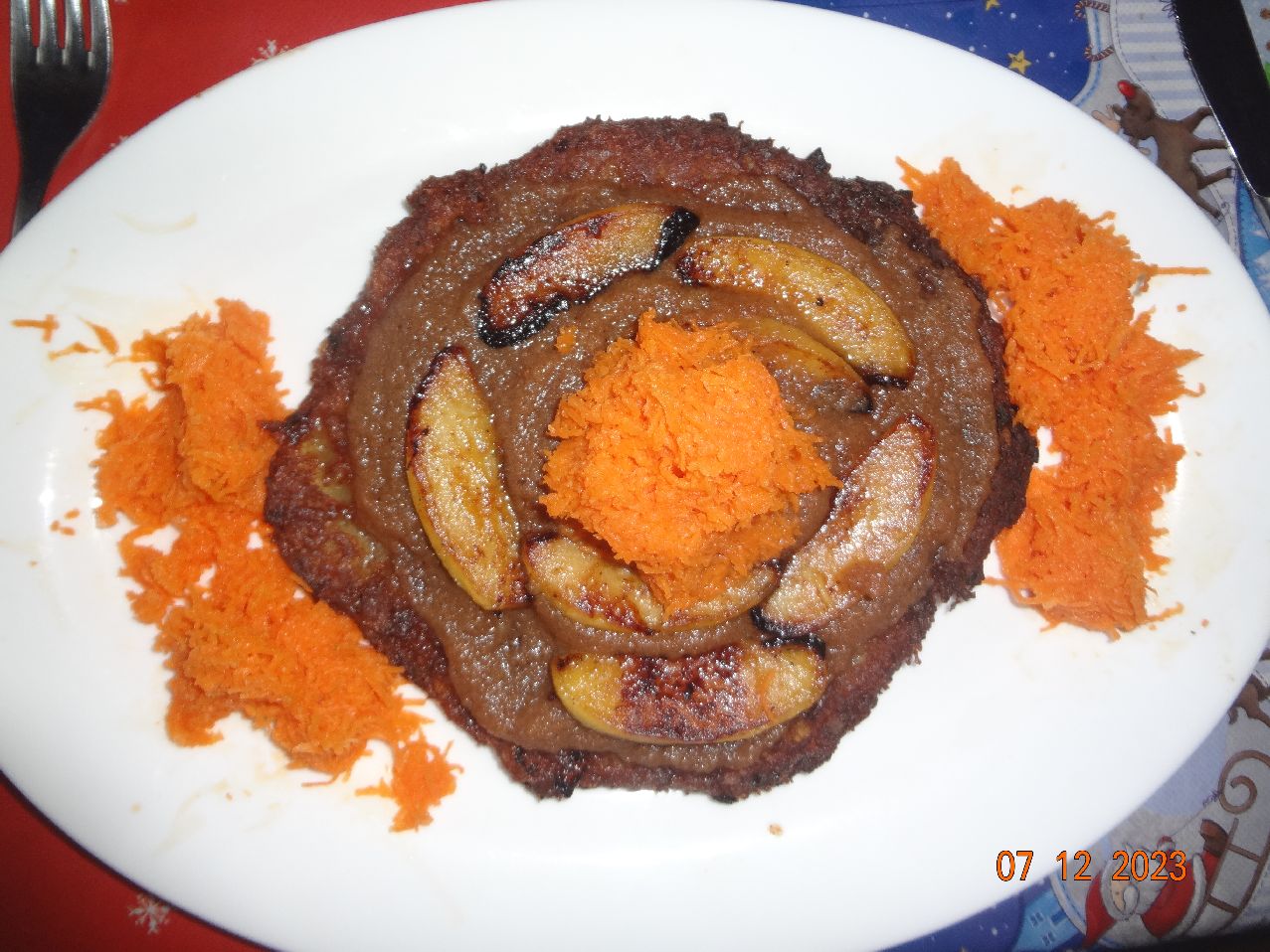 Kartoffel-Puffer mit Apfelmus, Apfel-Spalten, Möhrensalat