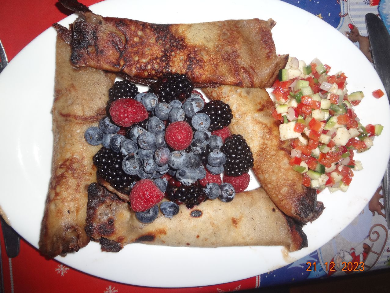 Apfelmus-Crêpes mit bunten Beeren, Gemüse-Mozzarella-Salat