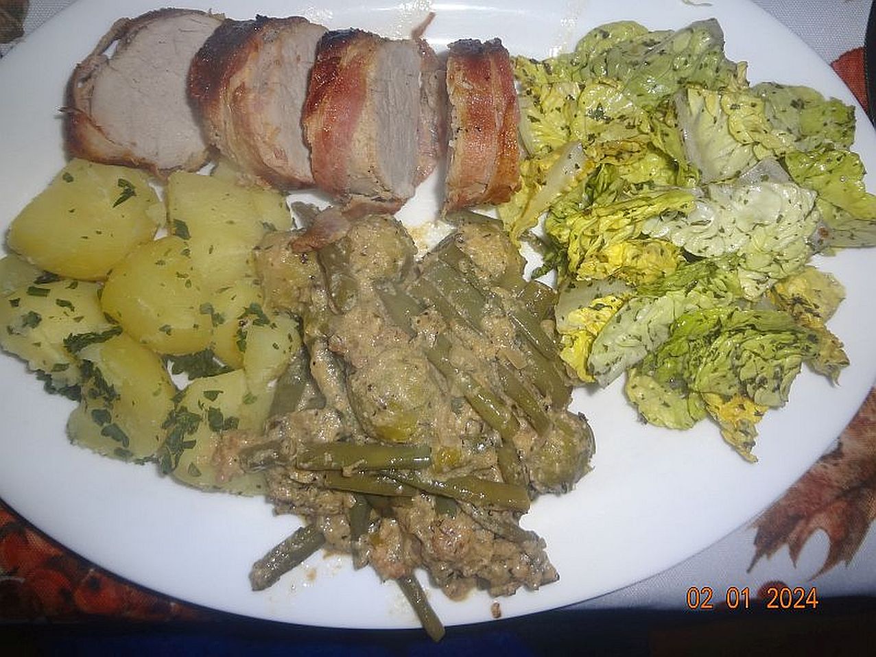 Schweine-Filet im Baconmantel, grüne Bohnen, Rosenkohl in spezieller Soße, Pet.-Kart., Salatherzen mit Kräutern |