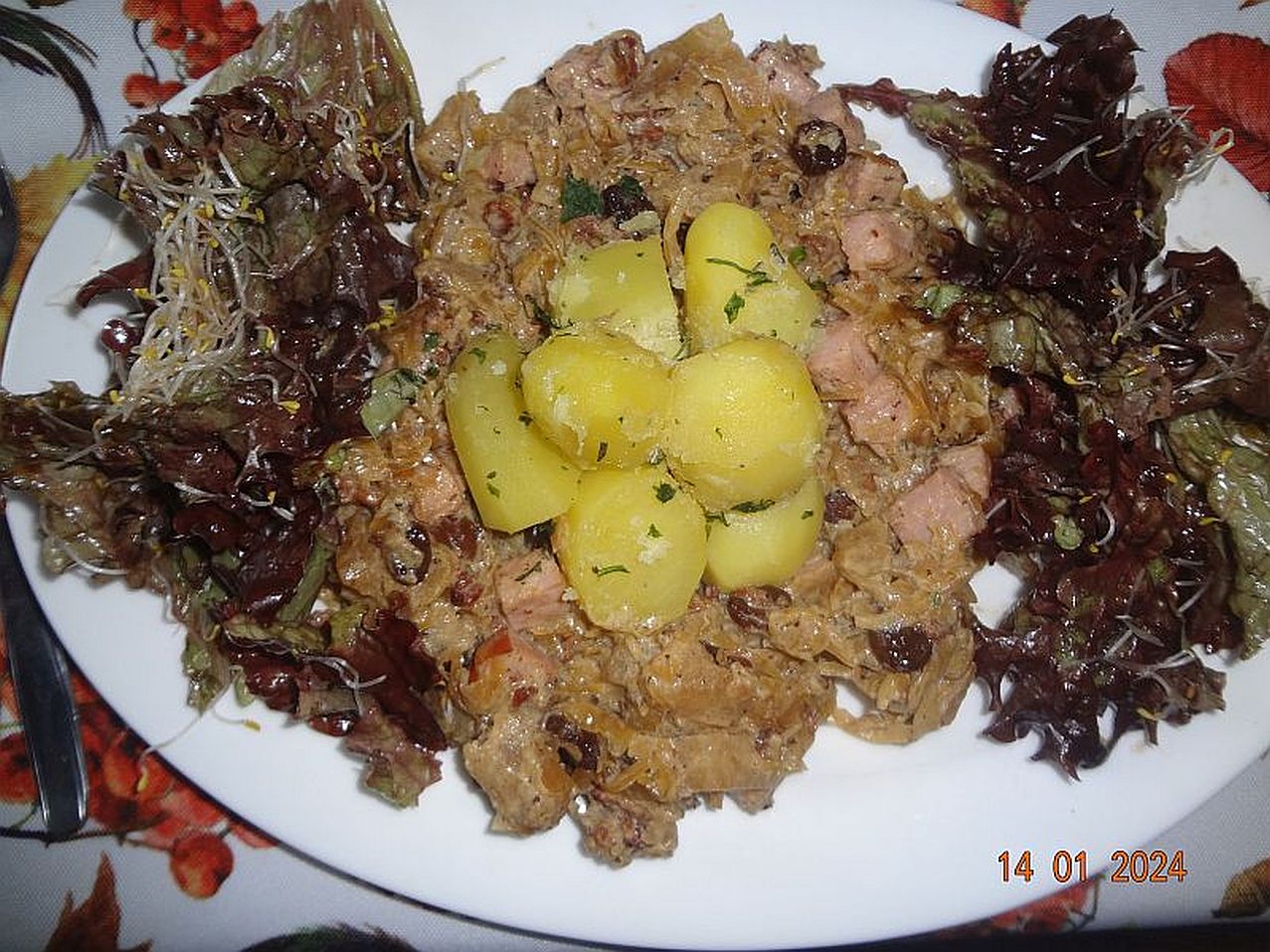 | | Kasseler mit Sauerkraut, Rum-Rosinen, Pet.-Kart., Frisée-Salat mit Sprossen |