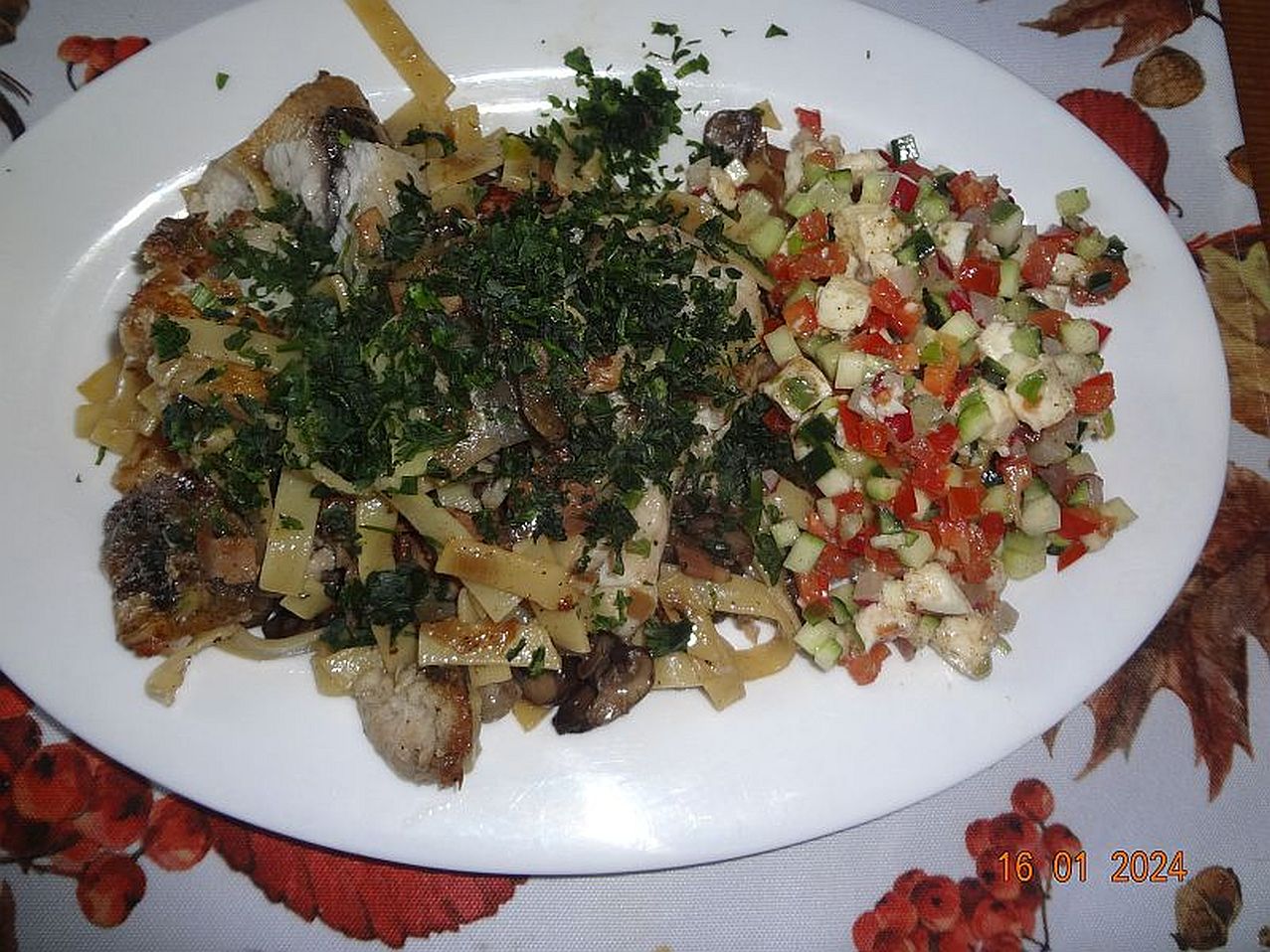 | | Pilz-Tagliatelle mit Karpfen, Gemüse-Mozzarella-Salat |