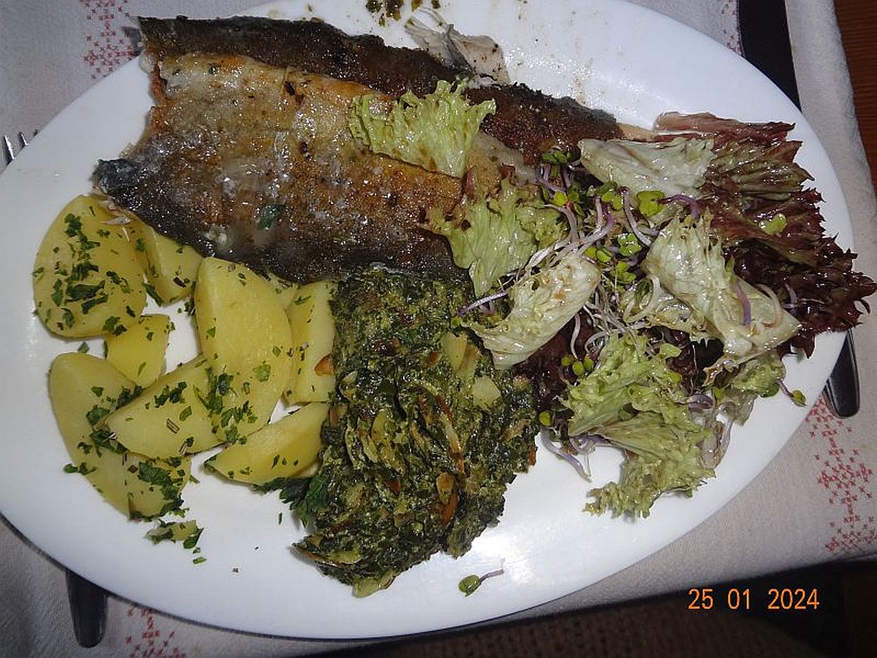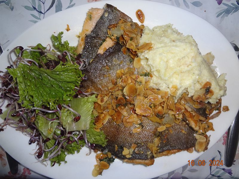 | | Forelle Müllerin, Mandel-Spinat, Pet.-Kart., Lollo-Rosso-Salat mit Ahornsirup, Balsamico, Leinöl |
