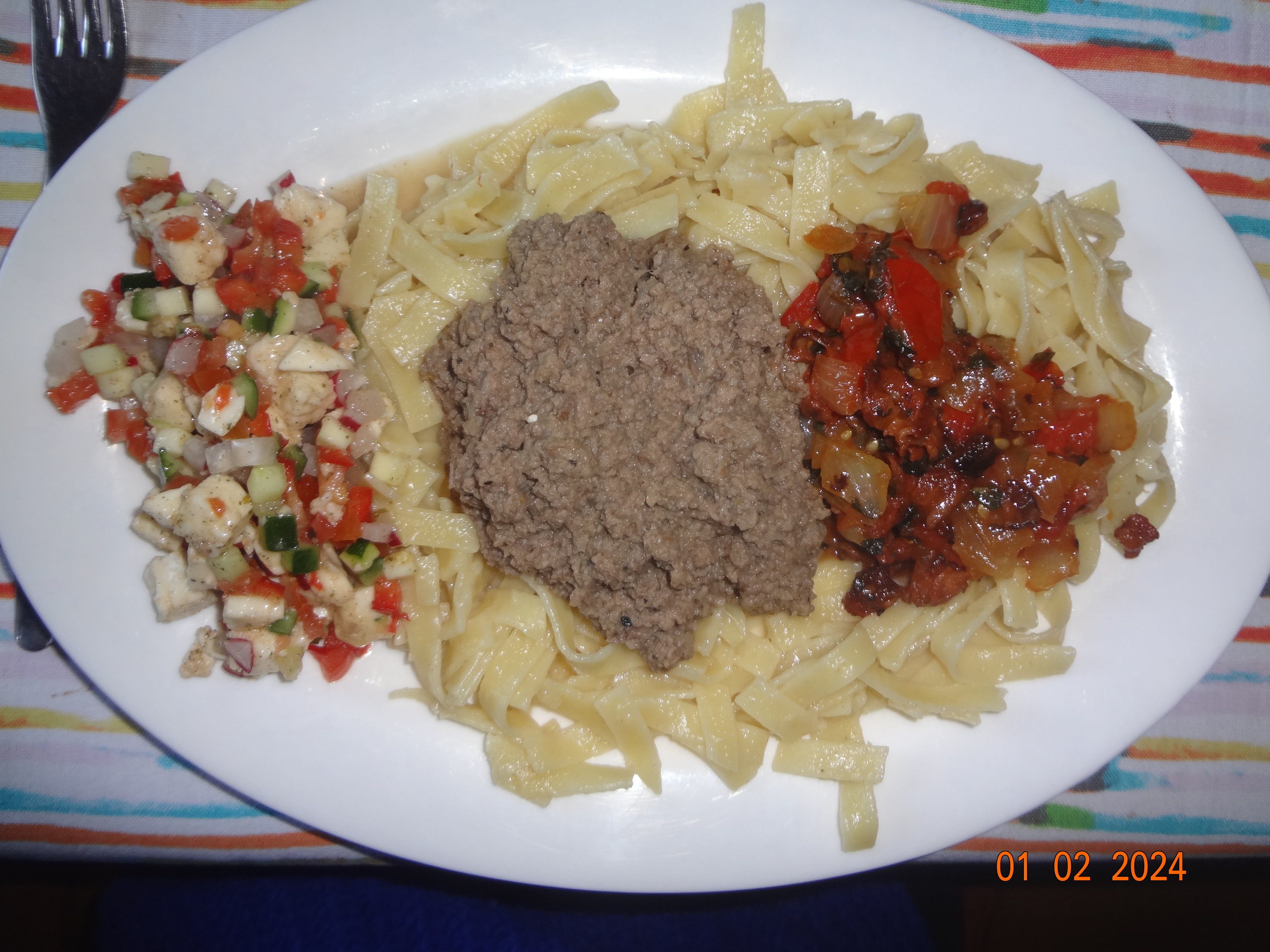 | | Auflauf mit Tagliatelle, Lachs, Garnelen, Mischgemüse und Ei-Schmand-Käse-Soße, Zucchini-Salat mit Radieschen und Paprika |