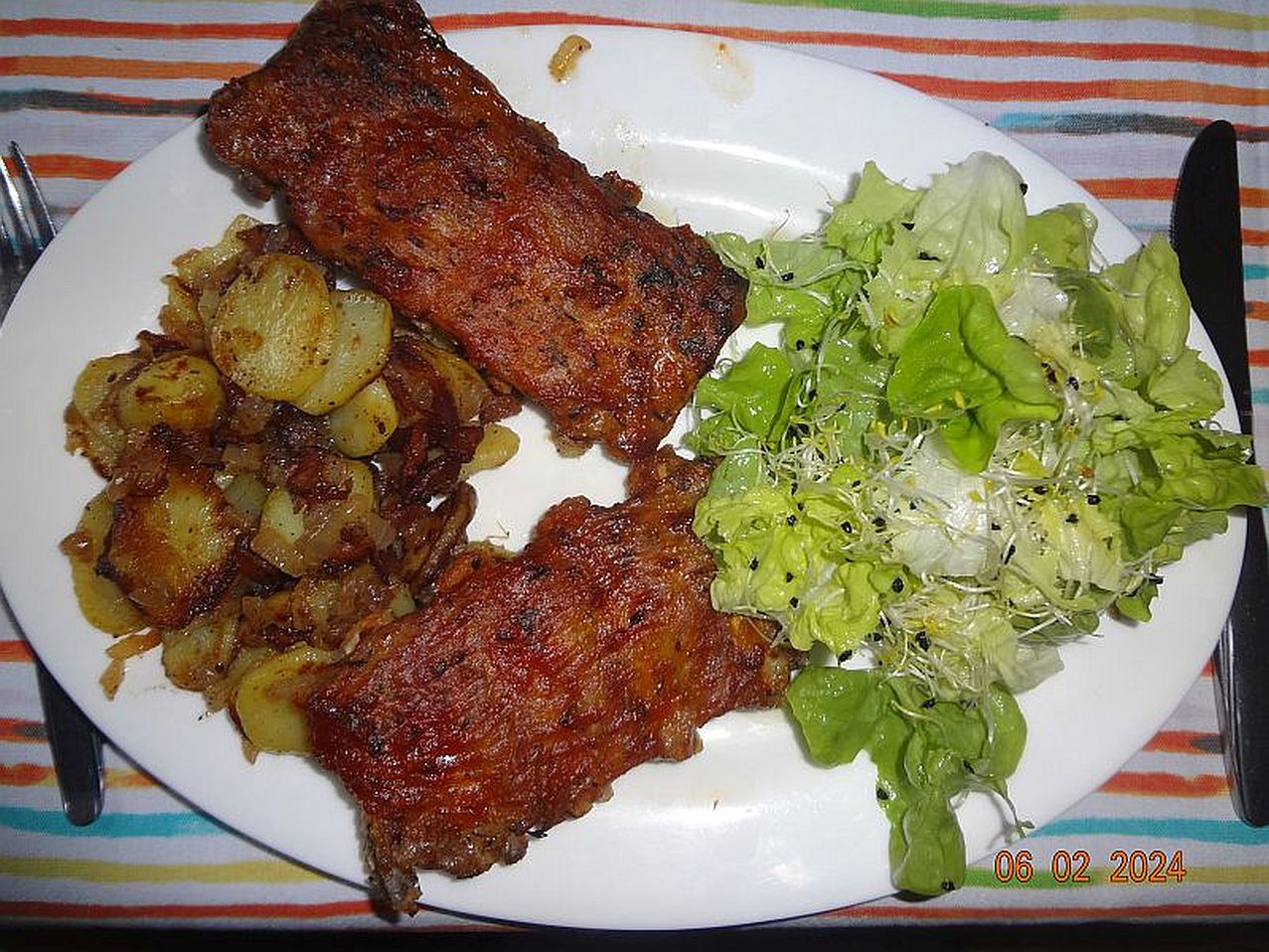 | | Glasierte Schweine-Rippchen aus dem Ofen, Bratkartoffeln, Eichblatt-Salat mit Sprossen, Ahornsirup, Zitronensaft, Leinöl |