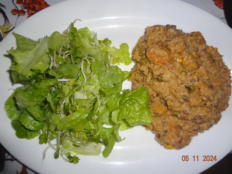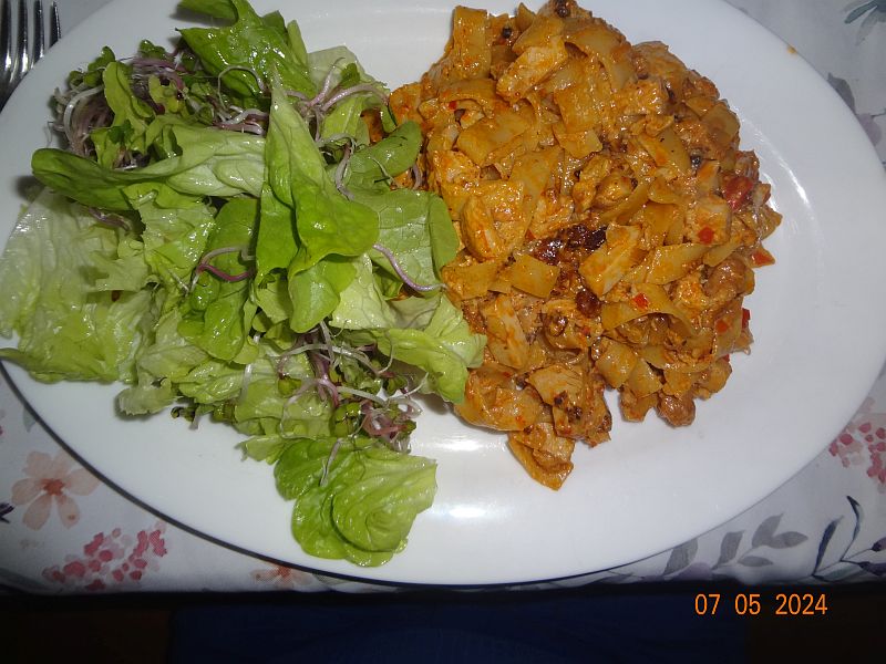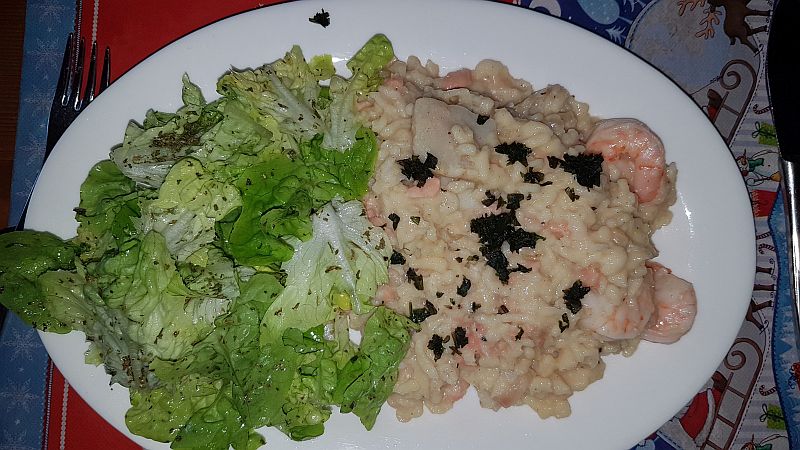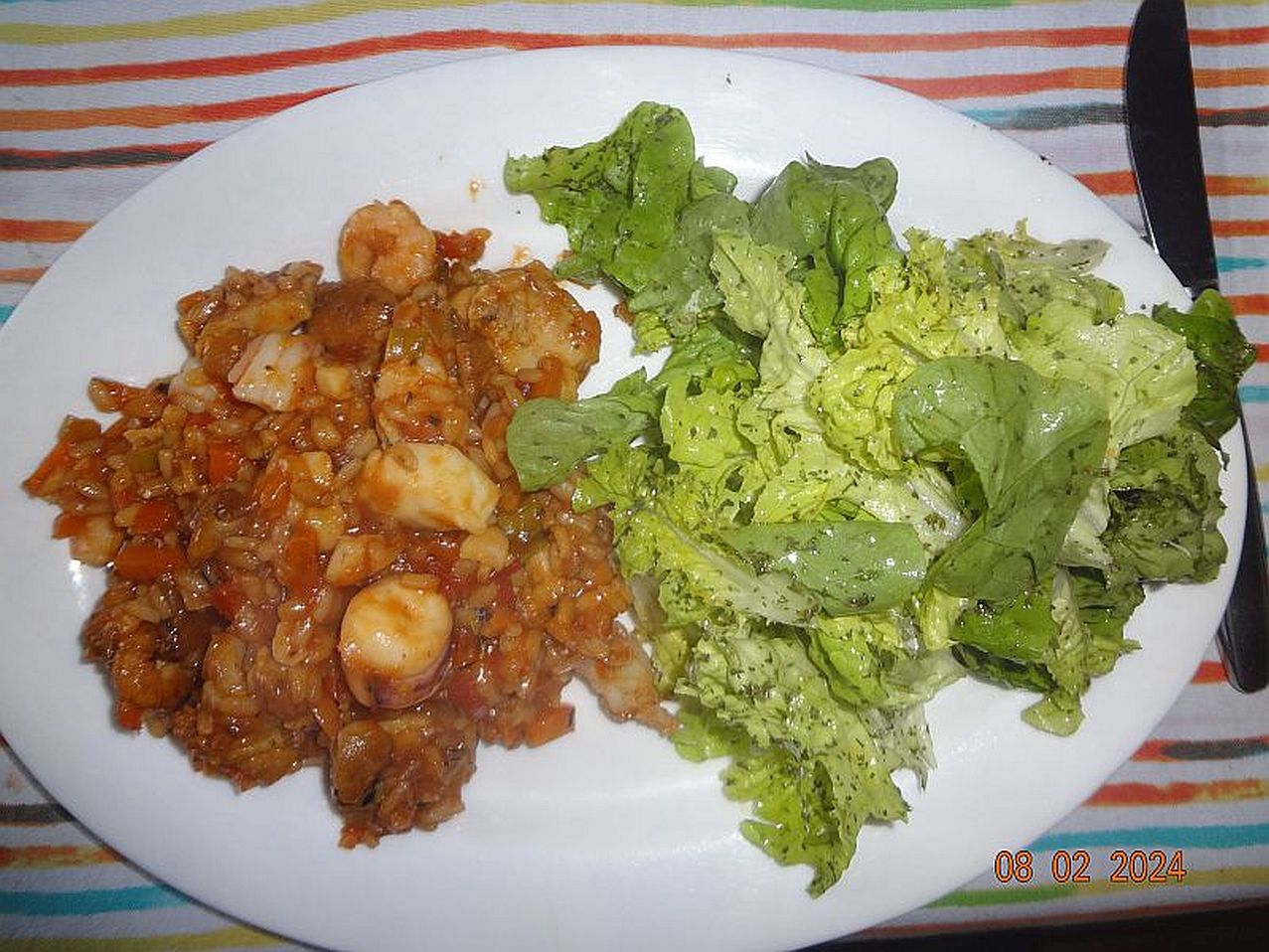 | | Paella mit Hähnchen-Fleisch, Meeresfrüchte, Eichblatt-Salat mit Kräutern, Ahornsirup, Zitronensaft, Leinöl |