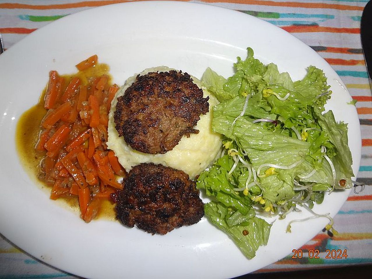 | | Rindfleisch-Buletten, Möhren-Stifte, Kartoffel-Käse-Wurzel-Püree, Frisée-Salat mit Sprossen |