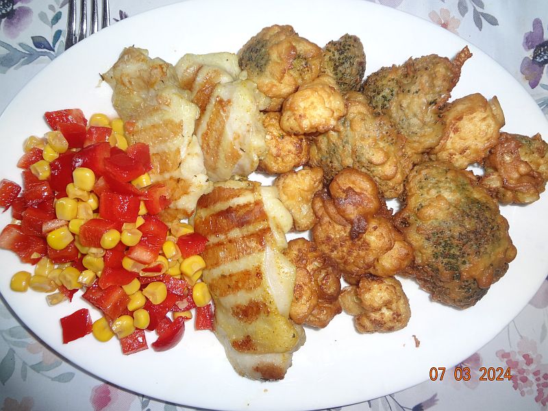 | | Brinierte, gegrillte Hähnchen-Stücke, Blumenkohl und Brokkoli im Schlafrock, Paprika-Mais-Salat |