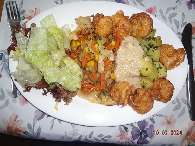 | | Garnelen im Schlafrock, Mischgemüse mit Mais, Wein-Schmand-Soße aus püriertem Fischfilet, Thymian-Pet.-Kart, Eisberg- und Frisée-Salat |