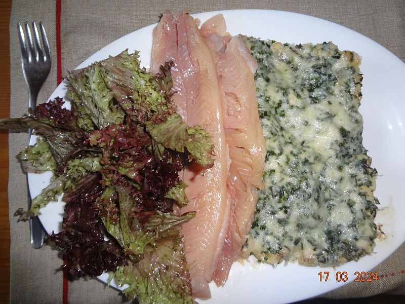 | | Gebratener Schellfisch, Spinat in Sekt-Schmand-Soße, Pet.-Kart., Möhrensalat |