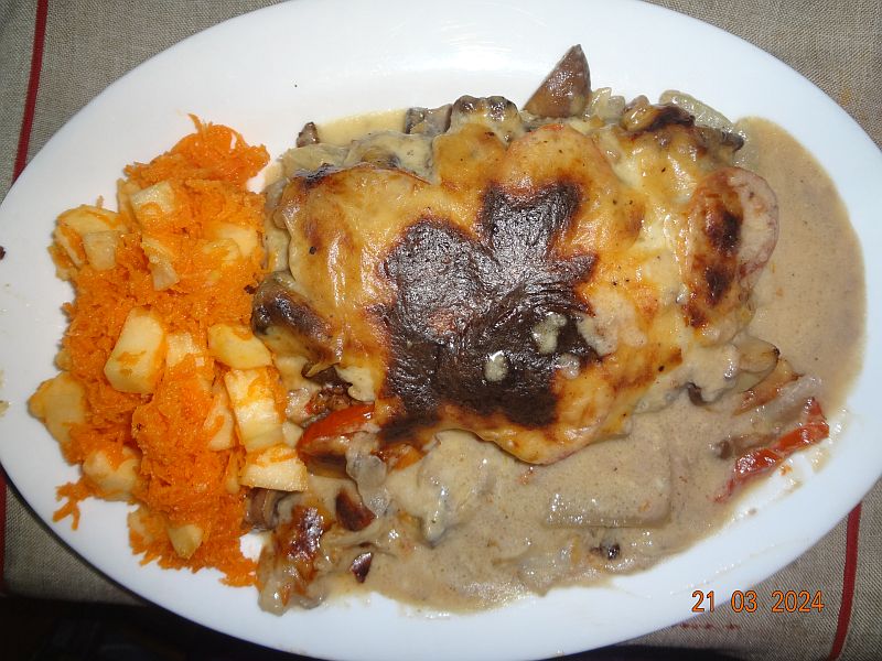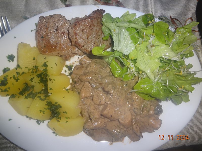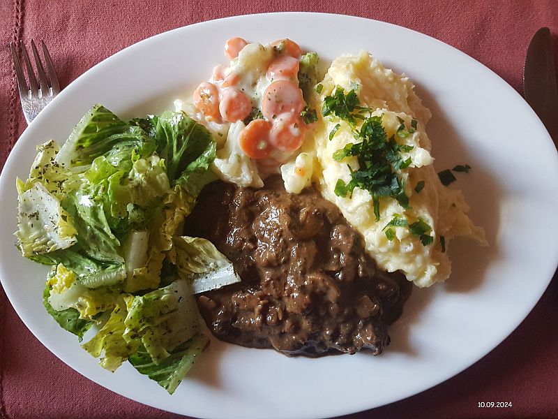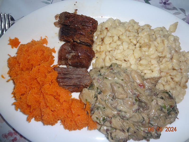 | | Rinderrücken, Waldpilze in Sekt-Rahm-Schmand-Soße, Spätzle, Möhrensalat |