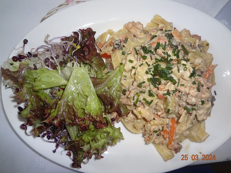 | | Tagliatelle, selbstgeräuchertes Wildlachs-Filet, Garnelen, Asia-Gemüse, Sekt-Schmand-Soße, Lollo-Rosso-Salat mit Rote-Bete-Sprossen |
