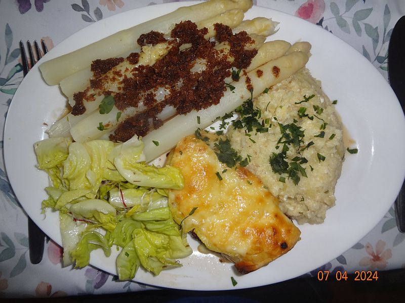 | | Kasseler-Hawai, Spargel mit Panko-Bröseln, Sellerie-Kart.-Püree, Endivien-Salat mit Sprossen |