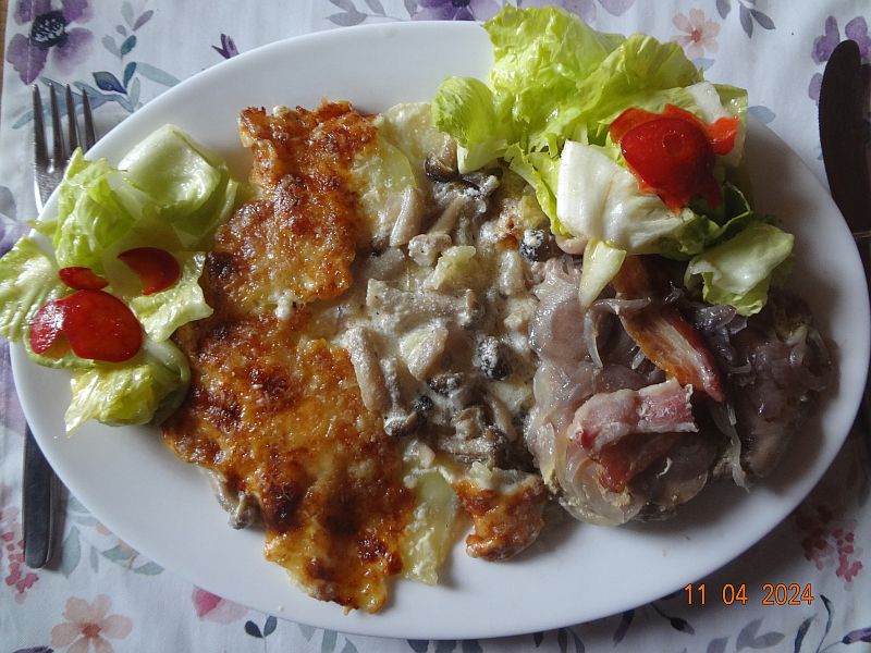 | | Schichtauflauf mit Kohlrabi-Scheiben, Zwiebeln, Hackfleisch, Champignons, Grieben aus Bacon, Tomatenscheiben, Käse-Bechamel-Soße, Möhrensalat mit Apfelstücken |