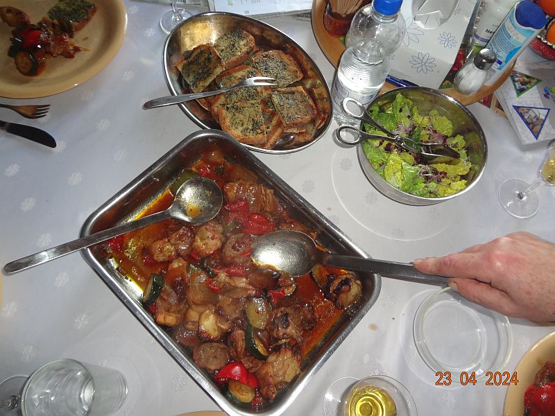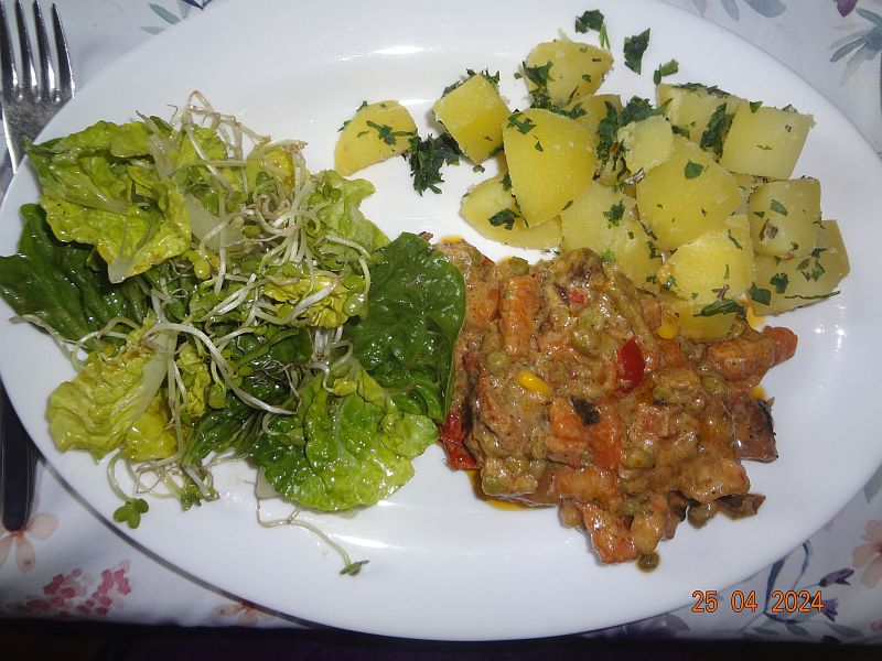 | | Schweine-Geschnetzeltes in Sekt-Schmand-Soße, Pfannengemüse, Pet.-Kart., Gemüsesalat mit Feta |