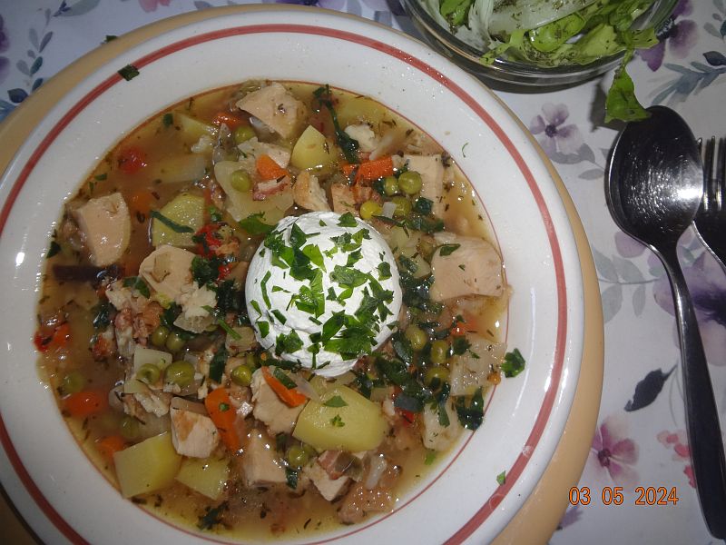 Hähnchen-Gemüse-Eintopf, Eichblatt-Salat mit Kräutern |