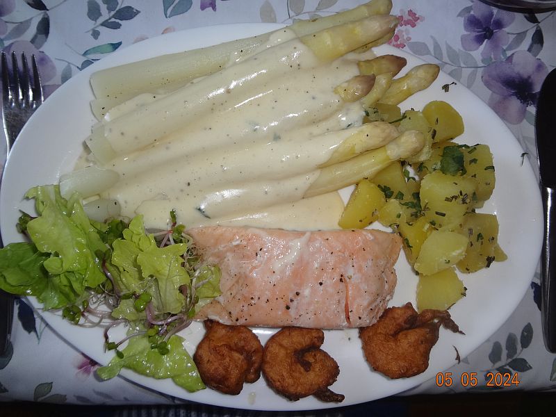 | | Vakuumgegartes Lachsfilet, Garnelen im Schlafrock, Spargel mit Bechamel-Soße, Pet.-Kart., Eichblatt-Salat mit Sprossen |