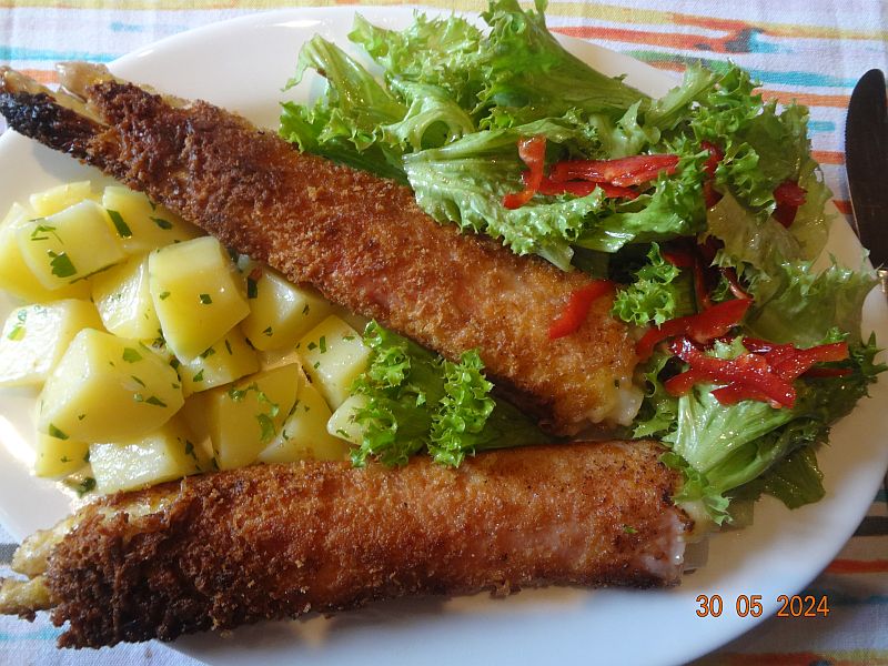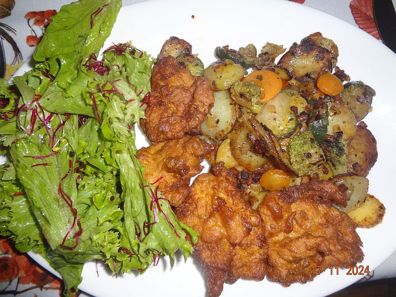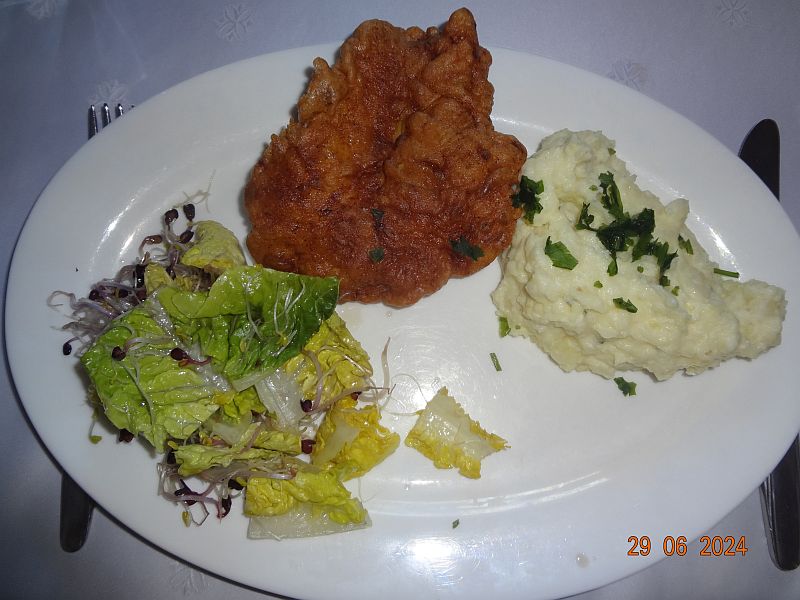 | | Fritierte, filetierte Schälrippchen, Mischgemüse mit Sekt-Rahm-Soße, gebutterte Pet.-Kart., Eichblattsalat mit China-Rose-Sprossen |