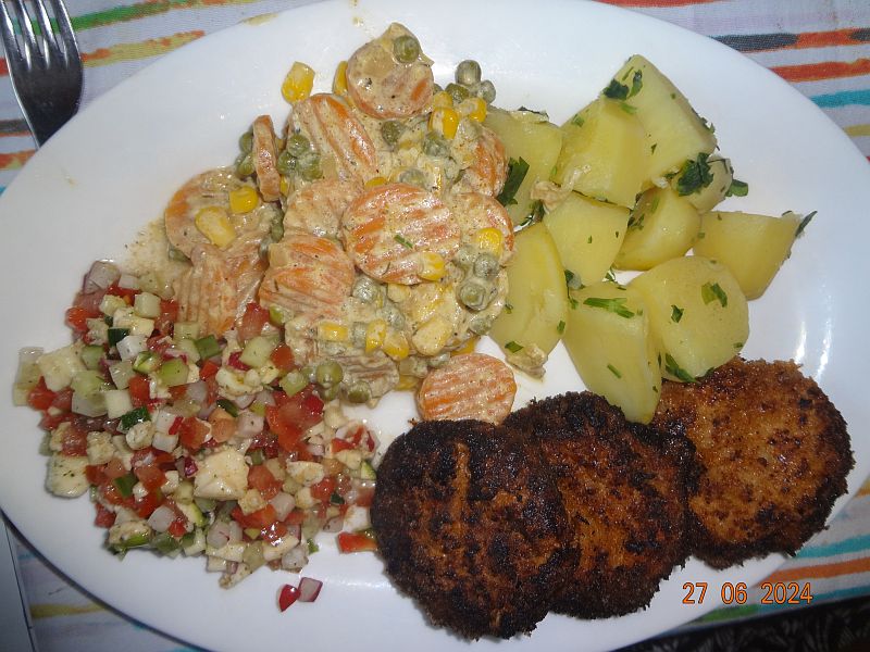 | | Salsiccia mit hh-Pesto, Asia-Gemüse mit Oliven, Bratkartoffeln, Gemüse-Mozzarella-Salat |