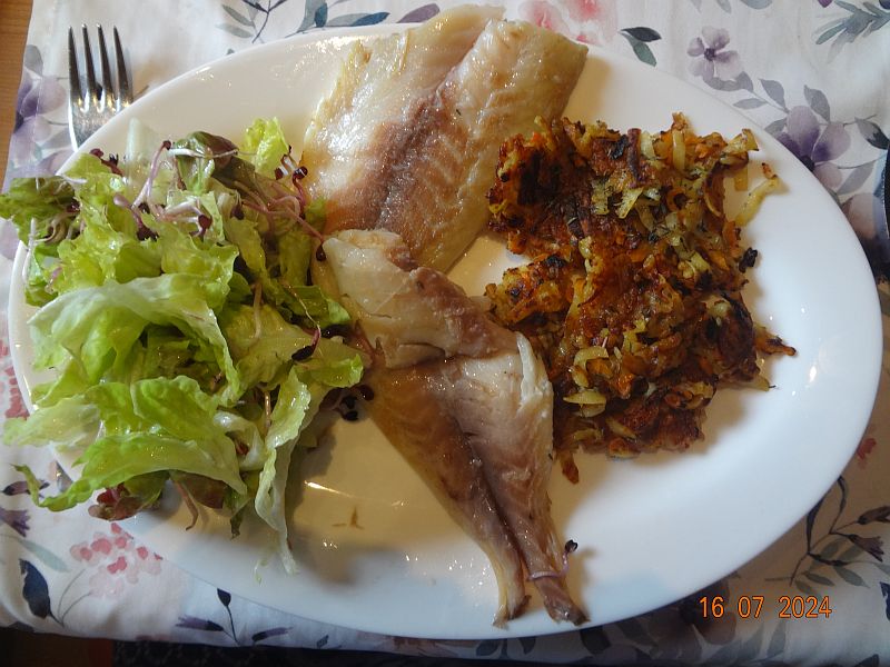 | | Selbstgeräucherte Dorade, Kart.-Möhren-Rösti, Eichblattsalat mit Sprossen |
