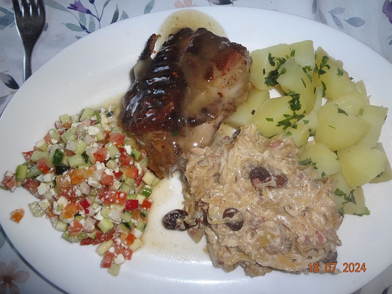 | | Gegrillte Schweinshaxe, Rum-Rosinen-Sauerkraut, Pet.-Kart., Gemüsesalat mit Feta |