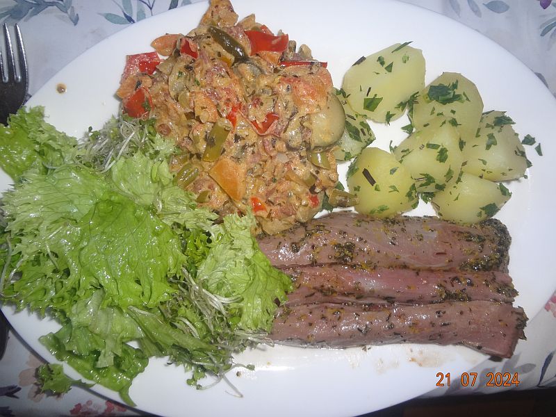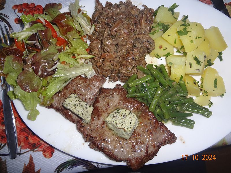 | | Gebratenes Nackensteak mit Kräuterbutter, Champignons in Steinpilzsoße, grüne Bohnen, Pet.-Kart., Eichblattsalat mit Paprika und Zucchini |