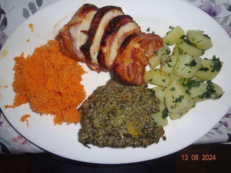 | | Schweinenacken-Rollbraten, grüne Erbsen, Pet.-Kart., Möhrensalat |