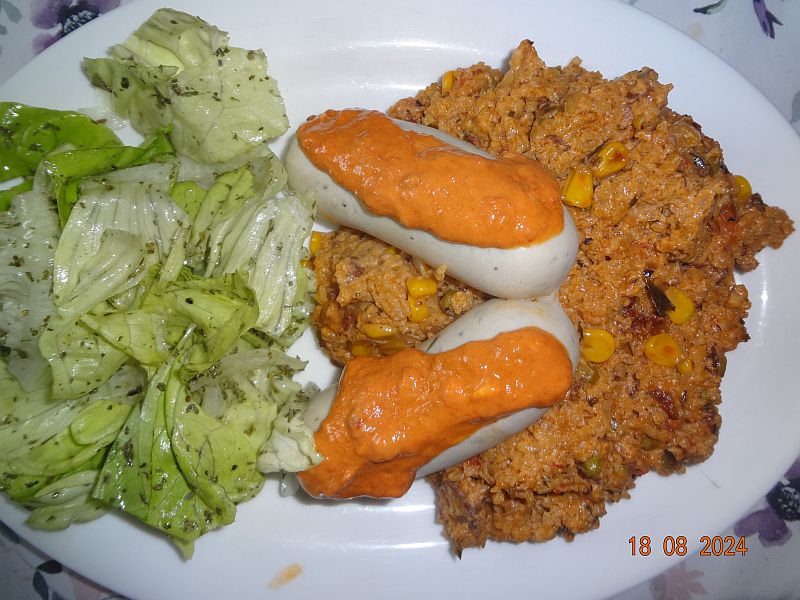 | | Weißwürste, Sekt-Schmand-Soße, Basmatireis mit Rindfleisch und Mais, Kopfsalat mit Kräutern |