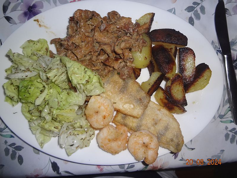 | | Zanderfilet und Garnelen, gebraten, Pfifferling-Gulasch, Bratkartoffel-Spalten, Kopfsalat mit Kräutern |
