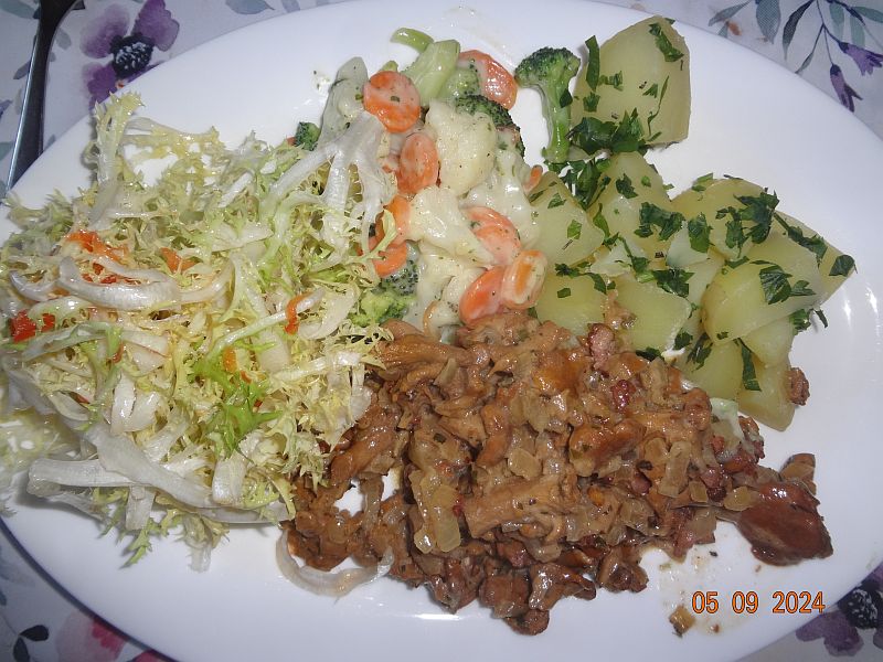 | | Pfifferlinge in Sekt-Schmand-Soße und Königsgemüse, Rosm.-Pet.-Kart., Frisée-Salat mit Paprika-Streifen |