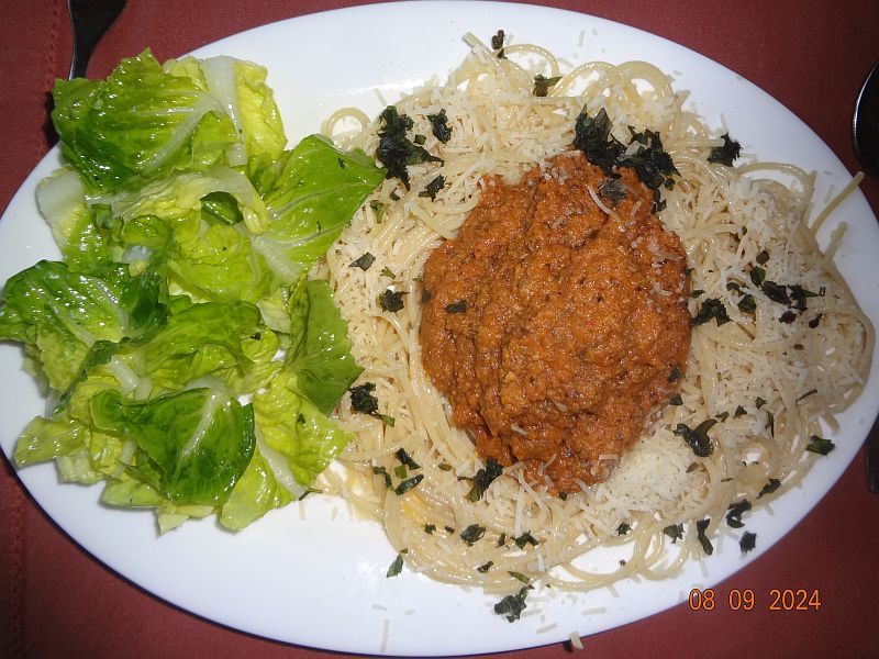 | | Spaghetti mit Bolognese aus selbstgeräucherten Hähnchenschenkeln, Mini-Römer-Salat |
