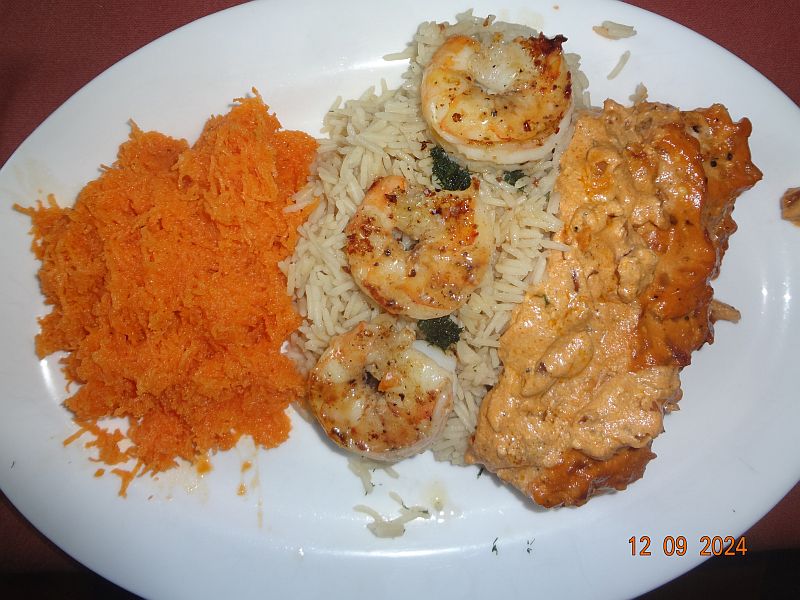 | | Lauch-Gratin mit Schmand-Creme-fraiche-Soße, Garnelen auf Basmatireis, Möhrensalat |