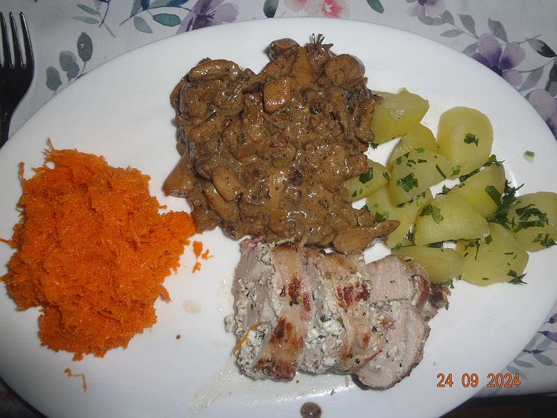 | | Gefülltes Schweine-Filet im Baconmantel, Kräuter-Saiblinge in Steinpilz-Sekt-Schmand-Soße, Pet.-Kart., Möhrensalat |