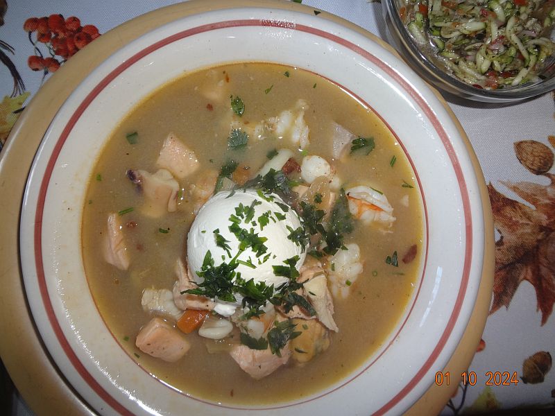 | | Suppe aus Fisch, Garnelen, Meeresfrüchten und Mischgemüse, Möhrensalat mit Apfel |