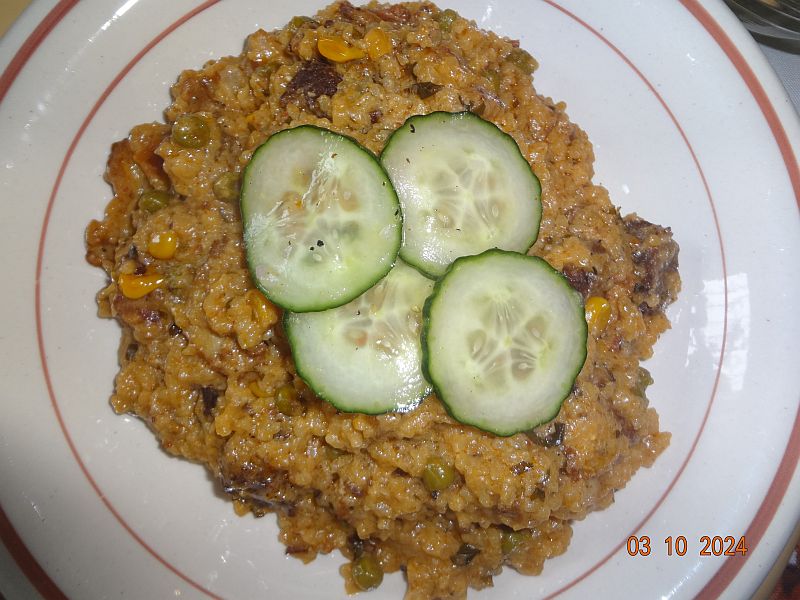 | | Basmatireis mit Rind- und Hähnchenfleisch, Gurkensalat |