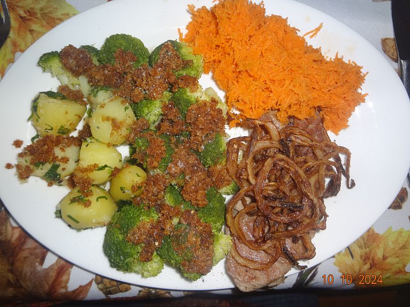 | | Nackensteak mit gegrillten Zwiebeln, gedünsteter Brokkoli mit gerösteten Panko-Bröseln, Pet.-Kart., Möhrensalat |