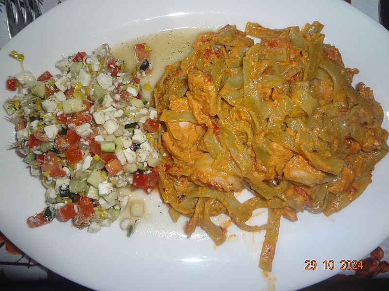 | | Selbstgemachte Spätzle mit Lachs, Scholle und Garnelen in Orangensoße, Eichblattsalat mit Kräutern |