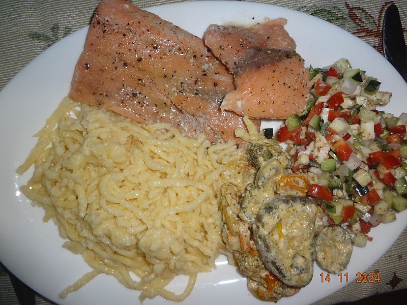 | | Vakuum-gegartes Lachsfilet, mediterranes Gemüse, selbstgemachte Spätzle, Gemüsesalat mit Mozzarella |