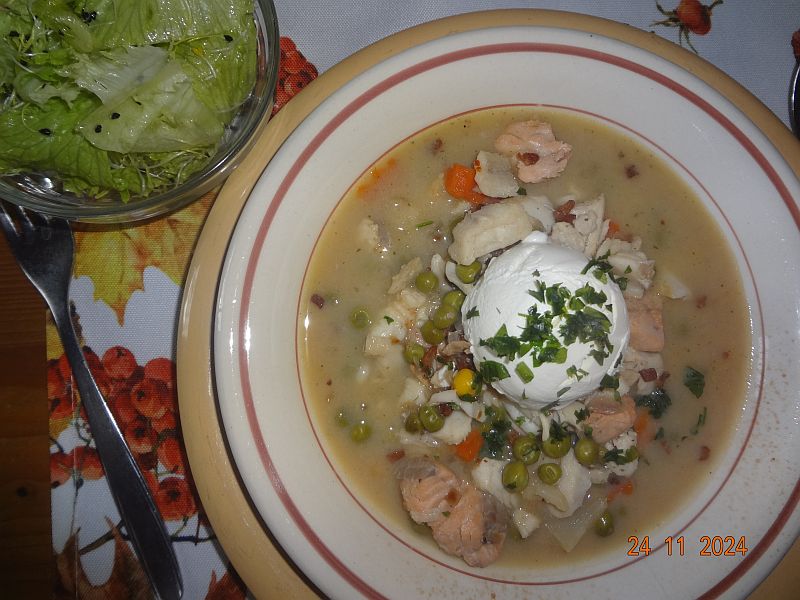 | | Fischsuppe mit Lachs, Garnelen, gemischtem Gemüse, Avocado und Schmand, Lollo-Bionda-Salat mit Radieschen-Sprossen |