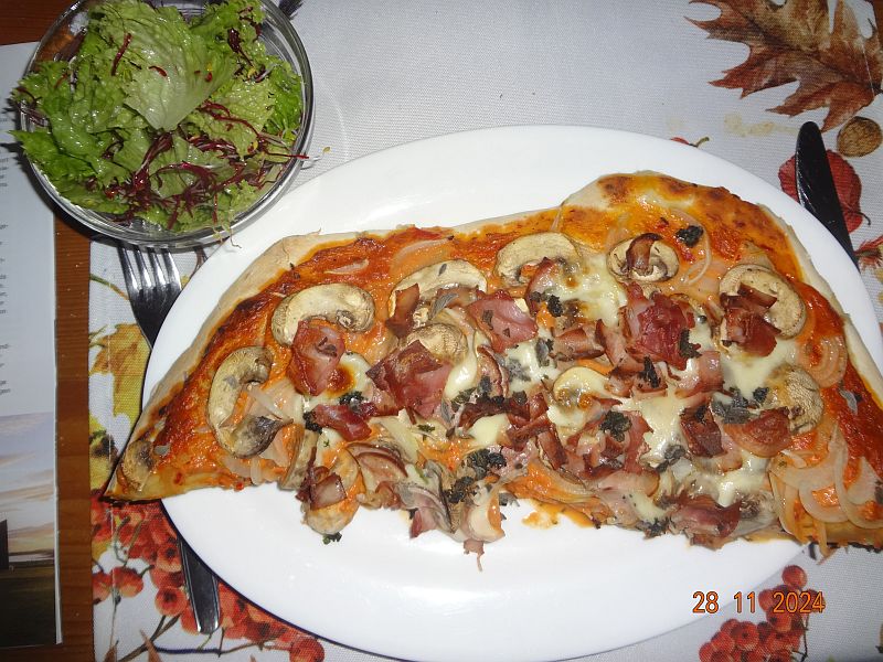 | | Pizza mit Tomaten-Ajvar-Schmand-Soße, Zwiebeln, Mozzarella-Kugeln, Landschinken und Römerbraten, Lollo-Bionda-Salat mit Sprossen |