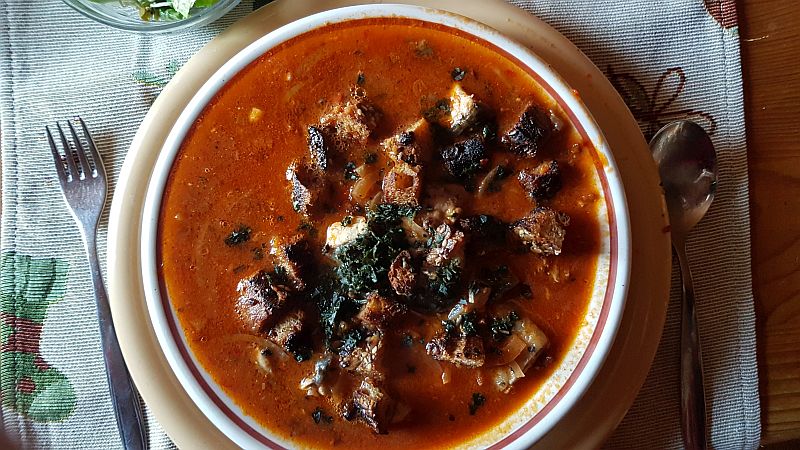 | | Schweinenacken-Gulasch mit Champignons in Steinpilz-Sekt-Schmand-Soße, Pet.-Kart., Eichblattsalat |