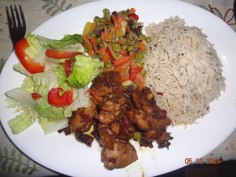 | | Hähnchen-Teriaki, gemischtes Gemüse, Basmatireis, Salatherzen mit Paprikastreifen |