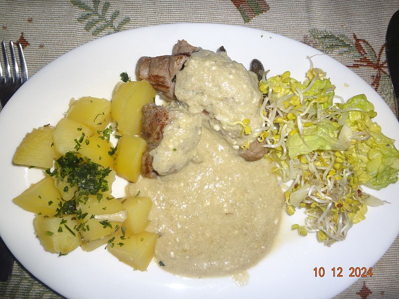 | | Schweine-Rouladen, Sellerie-Soße, Pet.-Kart., Salatherzen mit Sprossen |